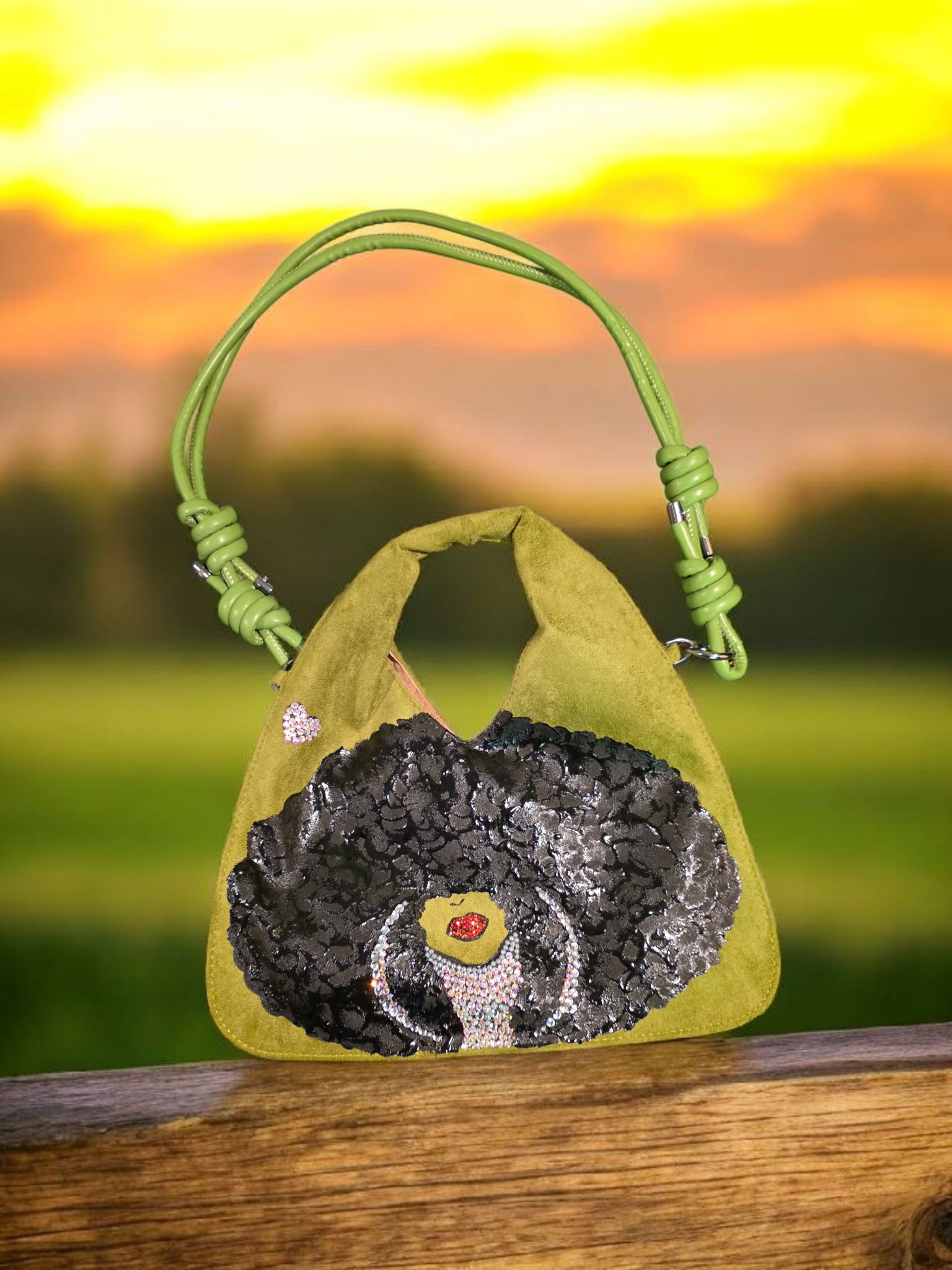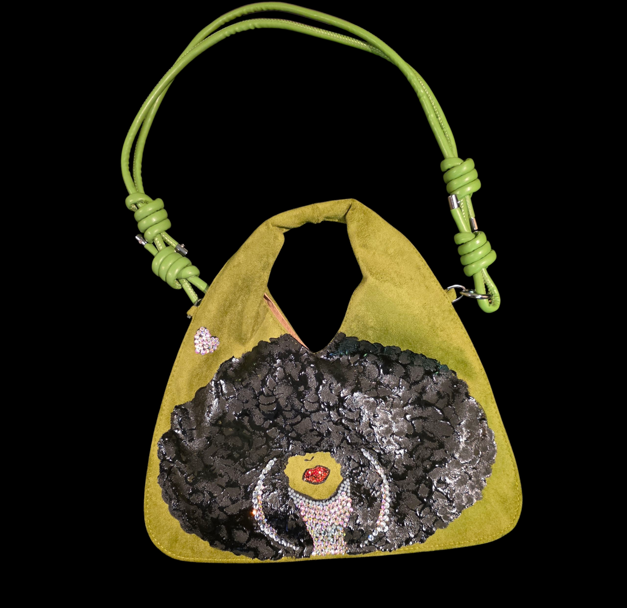 Add some flair to your style with our Afro Lady bag! Handpainted with a fierce 'fro and bling earrings, this bag is a fun and unique accessory for any outfit. Stay trendy and stand out from the crowd with this quirky bag. are a playful addition to any look. Perfect for those who dare to be different. (Not just for afro ladies!)