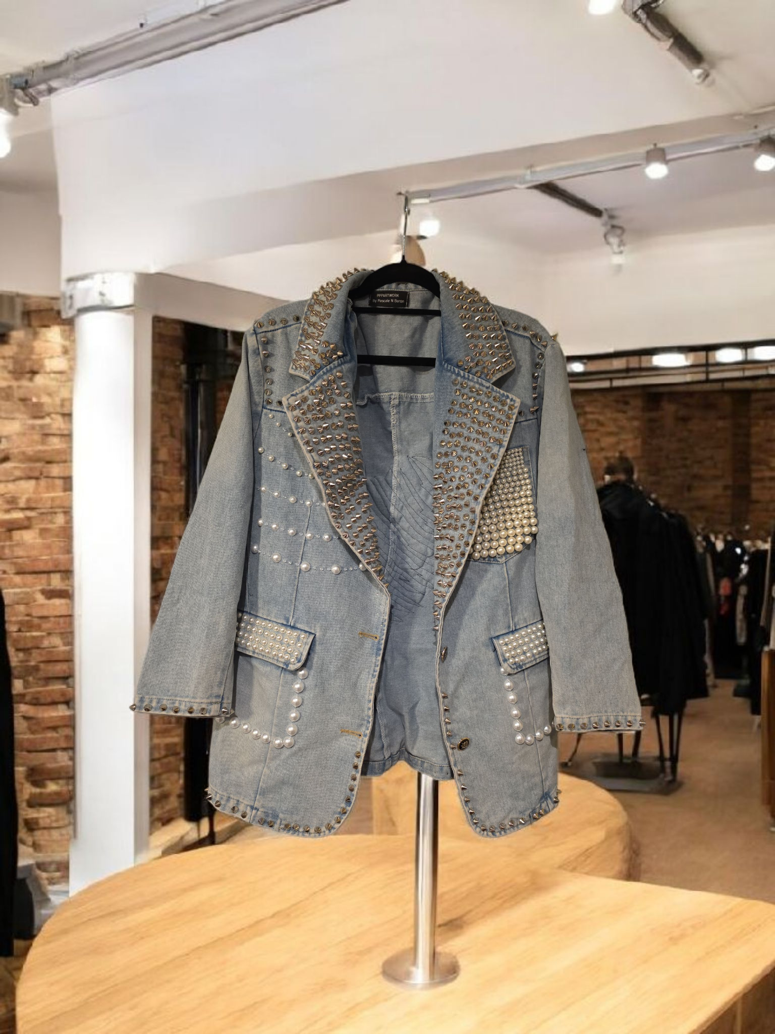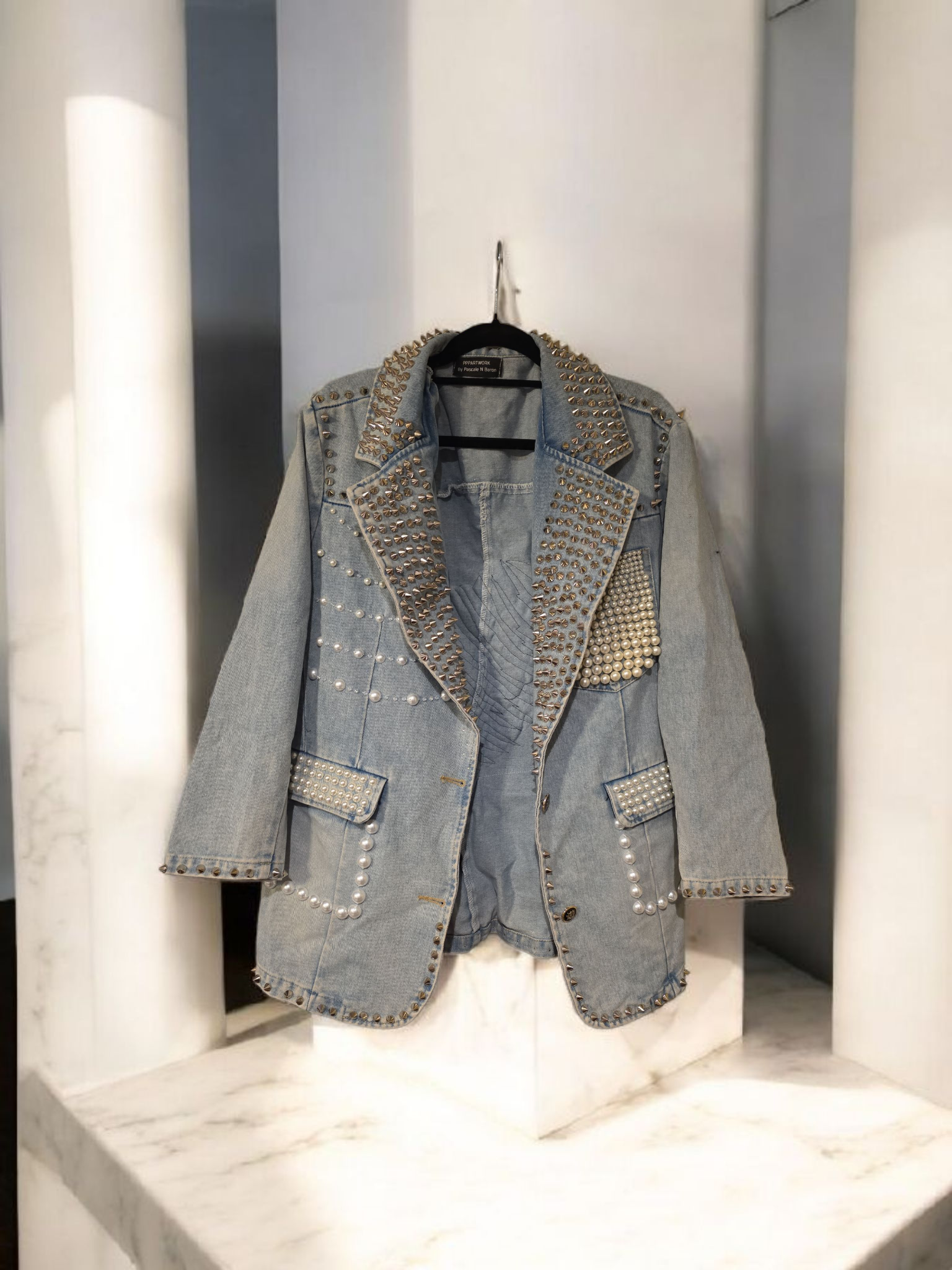 Beauty is Her Name! Look effortlessly stylish in this studded denim jacket, paired with a sleek silver shirt and dazzling bling earrings. With its cold water wash and hand dry instructions, this ensemble is not only fashionable, but also easy to maintain. Elevate your wardrobe with this must-have statement piece.