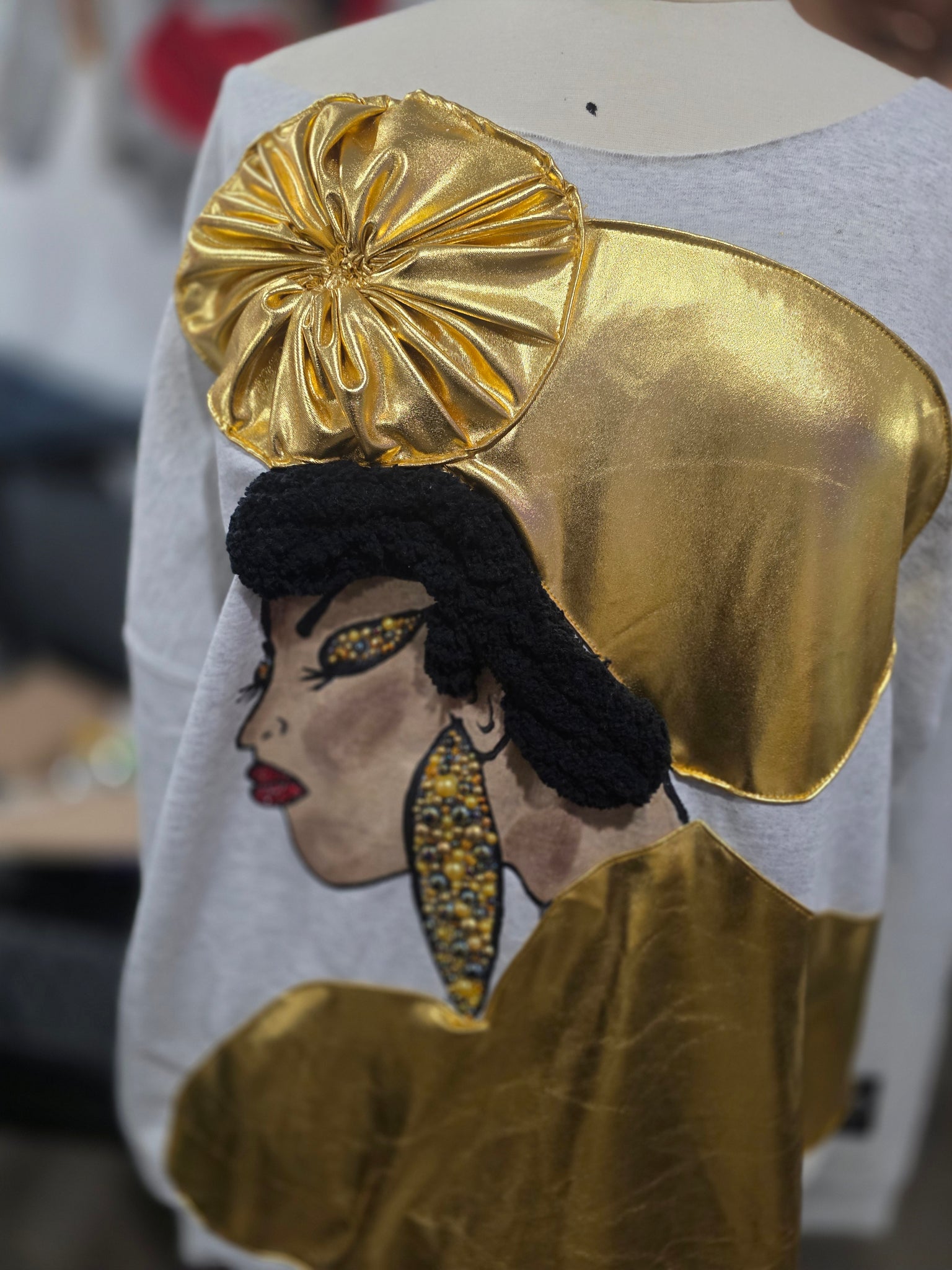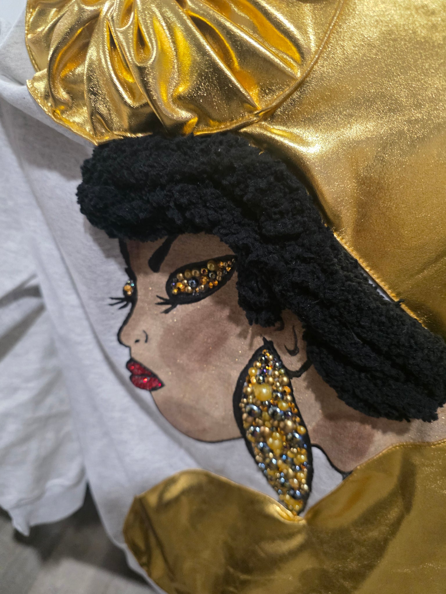 Introducing Gold Lady, the handpainted 3D hair doll with a gold headband and bling earrings. With her makeup on point, she's affectionately known as Goldie. Keep it cool with this cold water hand dry!