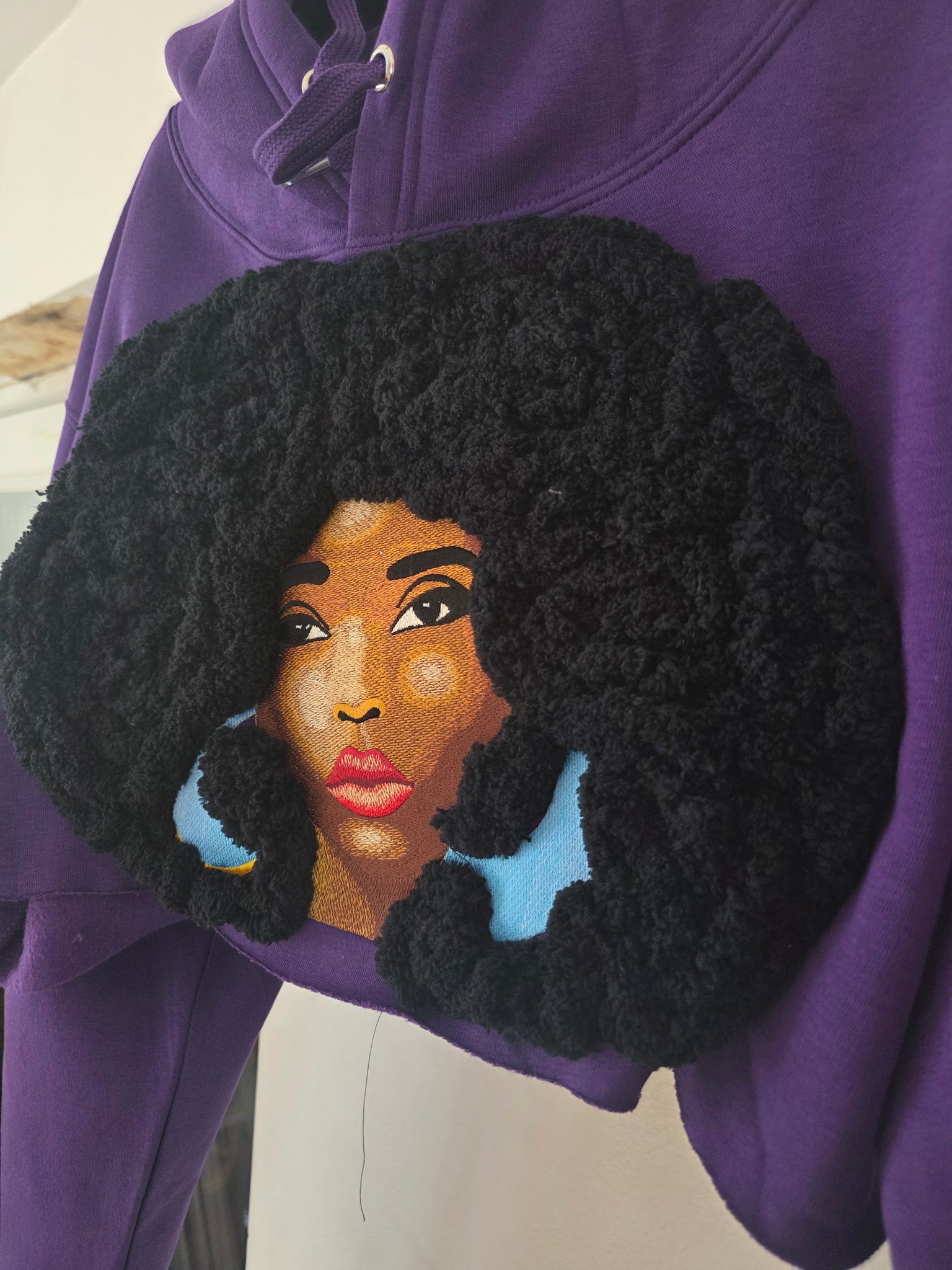 Rock your inner groovy style with our Purple Afro Crop Top Hoodie in size large! Featuring a funky afro design and a comfortable crop top fit, this hoodie is perfect for adding a playful element to your wardrobe. Get ready to turn heads and stand out with this hooded wonder!
