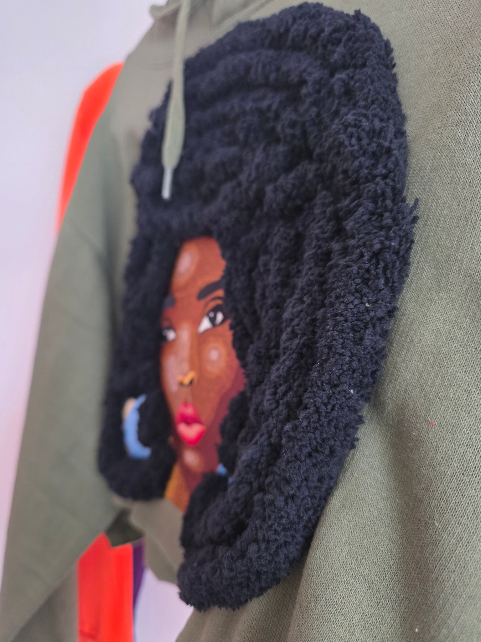 Upgrade your wardrobe with our stylish Hoodie 7. Featuring a crop top design, this hoodie is made of soft navy green fabric with an eye-catching face and afro design. Available in size 2xl for a comfortable fit. Perfect for any casual or sporty occasion.