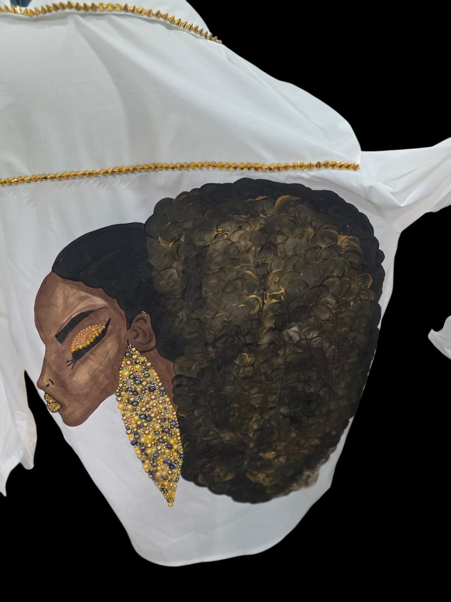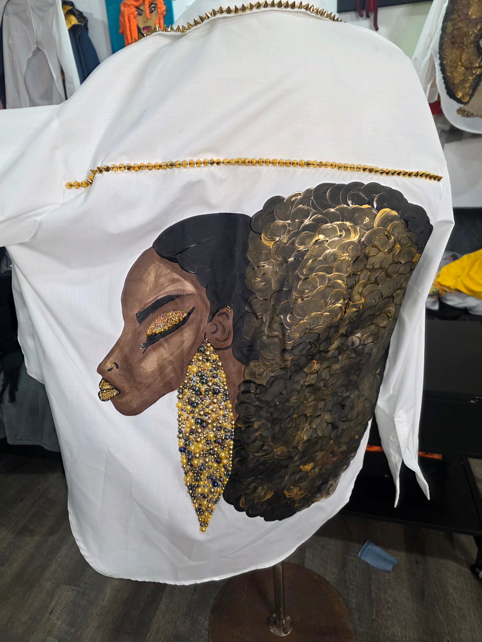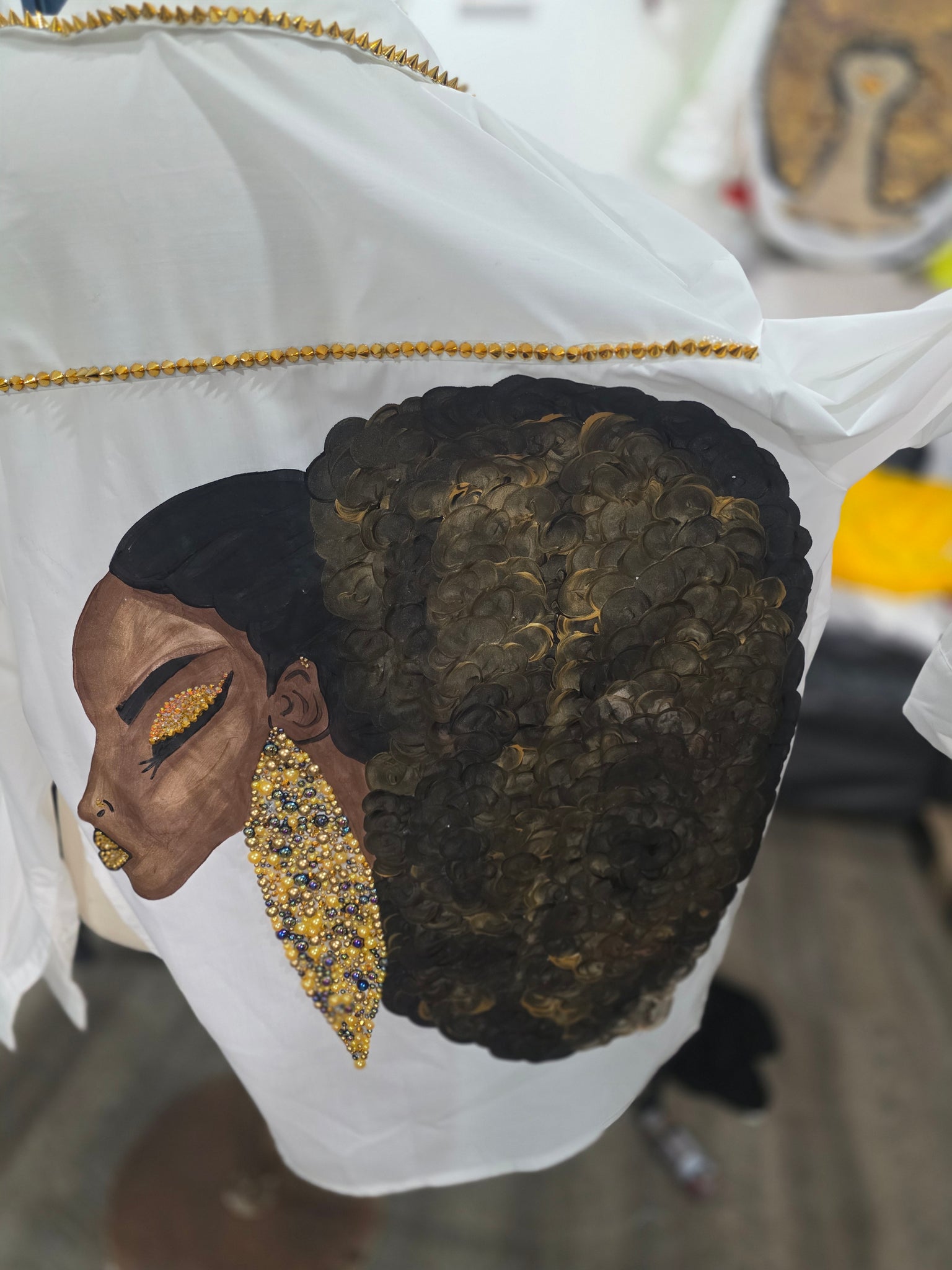 Discover the artistic charm of Ms Baron, a unique piece from our exclusive collection. Handpainted with meticulous detail, her bling earrings and striking lips bring a vibrant touch to any space. Embrace the beauty of handcrafted artistry and let your decor speak volumes! Wash in cold water and hang dry to maintain its stunning appeal.