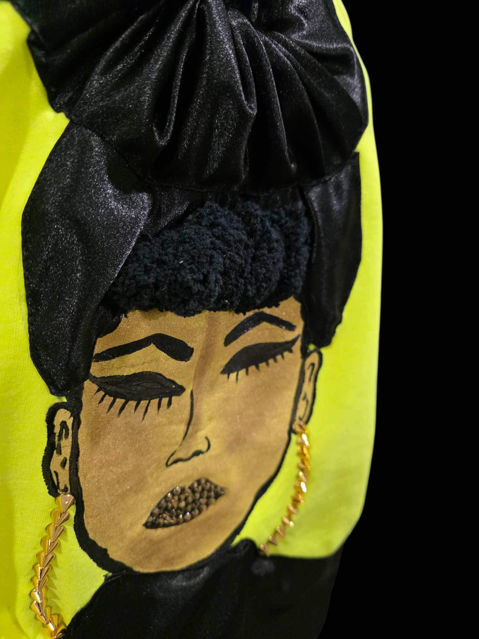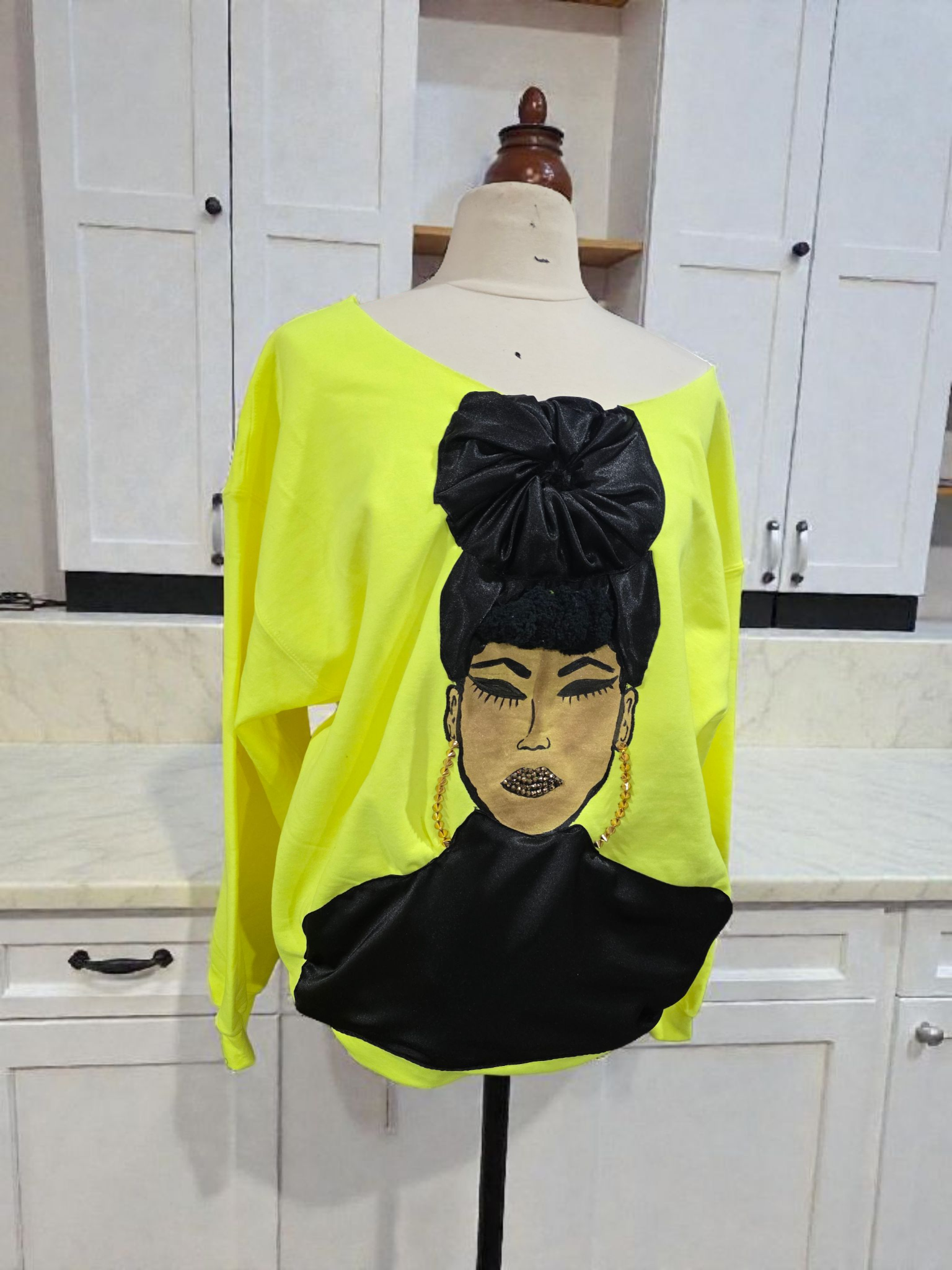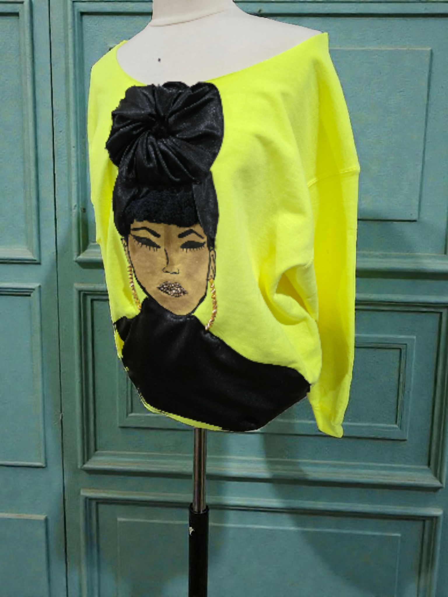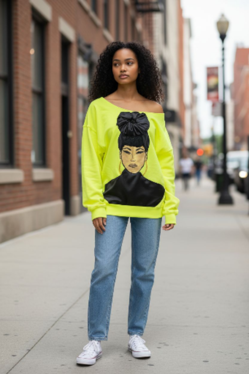 Get ready to meet Paige, the one-of-a-kind off-the-shoulder sweatshirt featuring a hand-painted design and a 3D head wrap. Perfect your style with the bonus pair of gold-studded earrings for a fun twist. Simply wash in cold water and hang to dry.